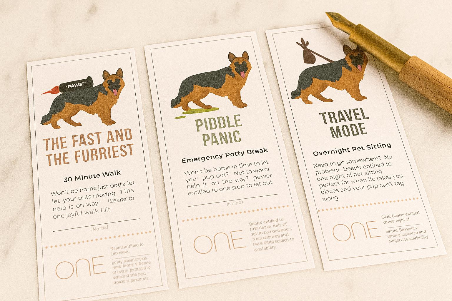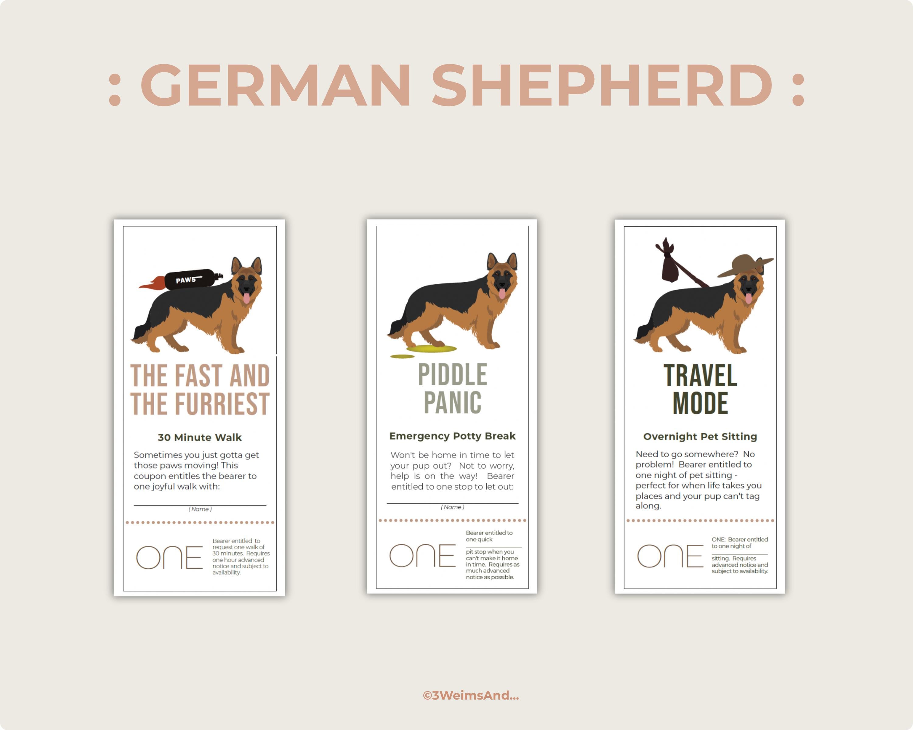 Do you secretly love taking care of your best friend’s dog? Then this gift is not only for them — it’s for you too! Give a thoughtful, “for the dog” gift with this editable German Shepherd Dog Coupon set — perfect for dog walking, pet sitting, and puppy care surprises. This printable voucher makes an adorable dog lover gift, sitter thank-you, or last-minute appreciation gift you can personalize and print at home.