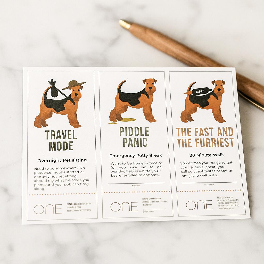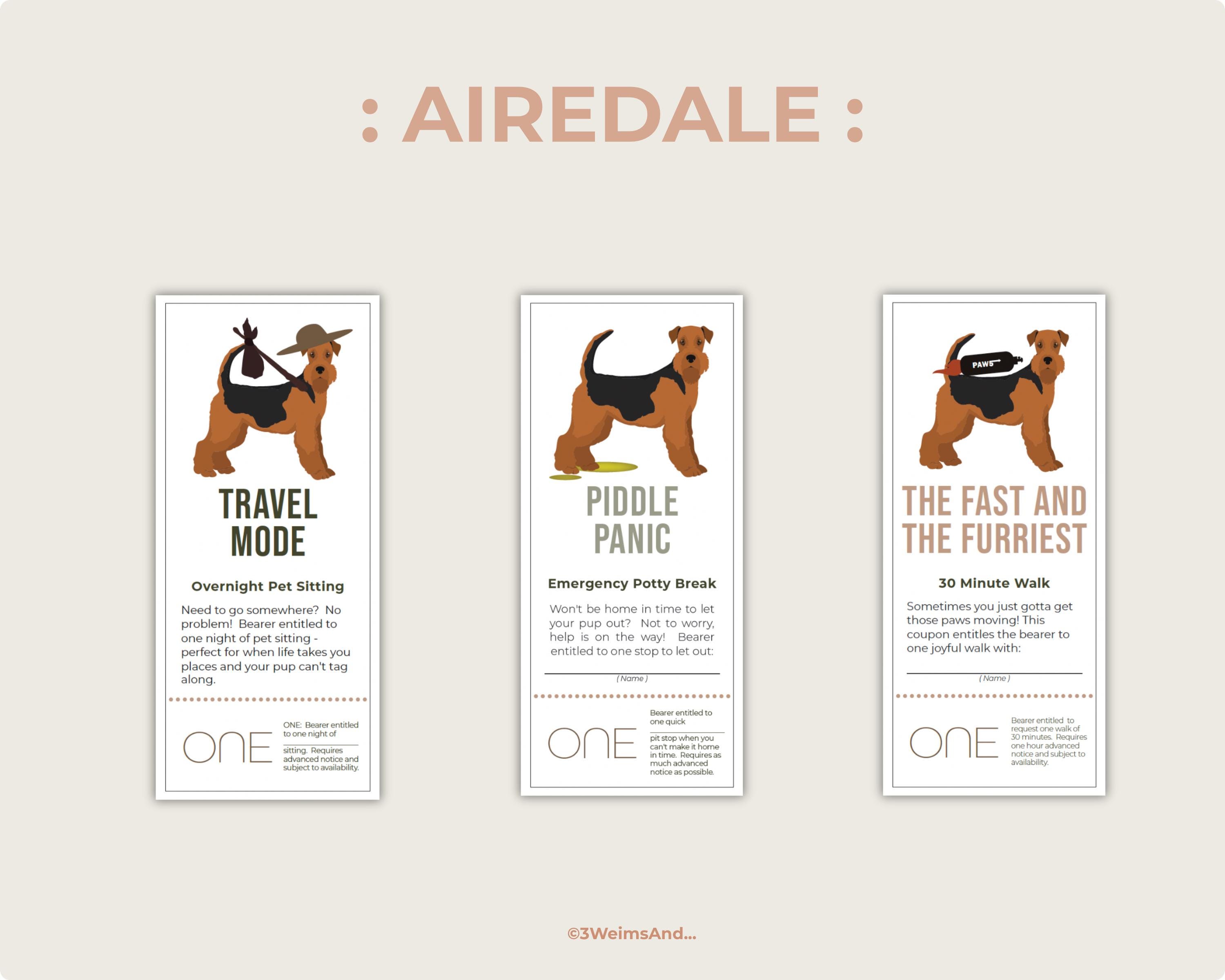 Do you secretly love taking care of your best friend’s dog? Then this gift is not only for them — it’s for you too! Give a thoughtful, “for the dog” gift with this editable Airedale Dog Coupon set — perfect for dog walking, pet sitting, and puppy care surprises. This printable voucher makes an adorable dog lover gift, sitter thank-you, or last-minute appreciation gift you can personalize and print at home.