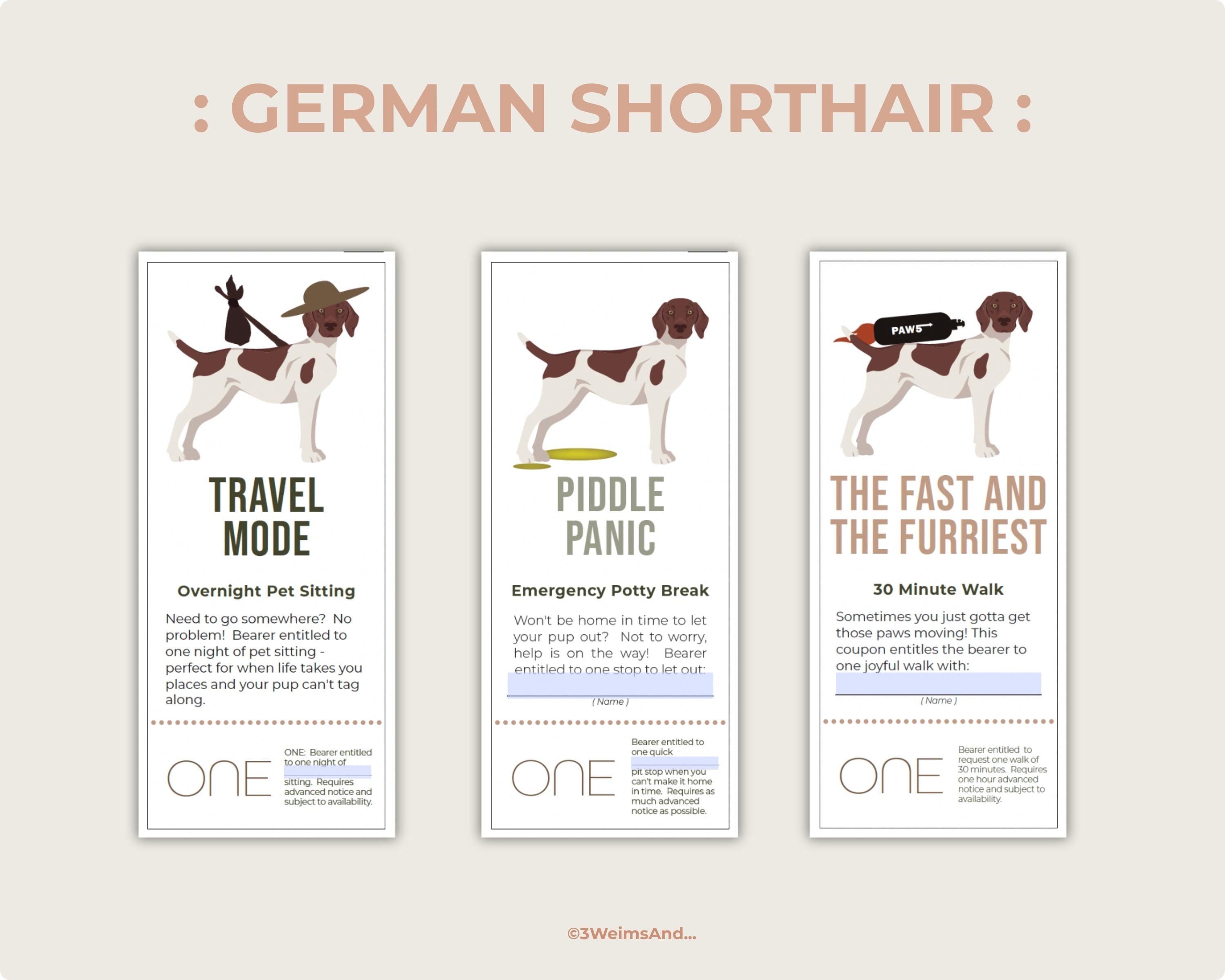 Do you secretly love taking care of your best friend’s dog? Then this gift is not only for them — it’s for you too! Give a thoughtful, “for the dog” gift with this editable German Shorthair Pointer Dog Coupon set — perfect for dog walking, pet sitting, and puppy care surprises. This printable voucher makes an adorable dog lover gift, sitter thank-you, gifts for him, or last-minute appreciation gift you can personalize and print at home.